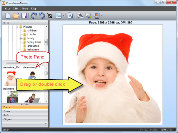 To begin, click Photo tab and open the photo disk, select the favorite photo in your photo pane that you want to apply effect. Double click it or drag the photo in the working area.