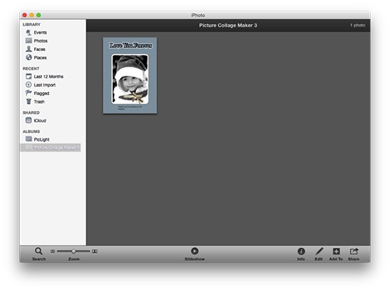 Name the collage as you wish. After exporting to iPhoto successfully, you will see it in an album named Picture Collage Maker 3 in iPhoto.