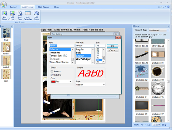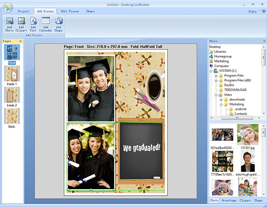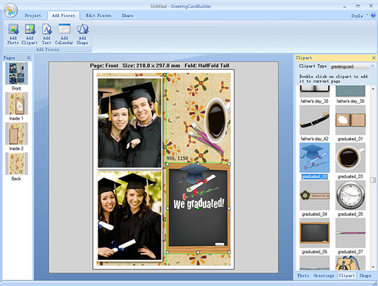 Graduation is a time of great accomplishment. Celebrate this momentous occasion with a personalized graduation gift decorated with significant photos, colorful clipart, best congratulation wishes, etc. Click Add Pieces button on top of window and then you can finish adding all these embellishments and get some beautification effects.
