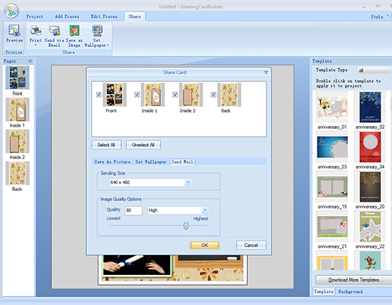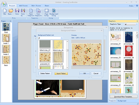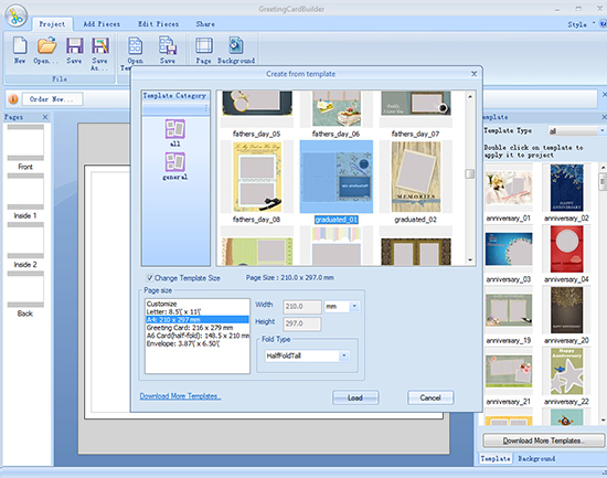 Open this card maker and click Create From Template button. Next you will see varieties of beautifully designed templates appear in the popup window where you can choose your favorite graduated template. There are lots of options in Change Template Size that allow you to set page size as letter, envelope, greeting card, etc. or customize it by setting your own width and height.