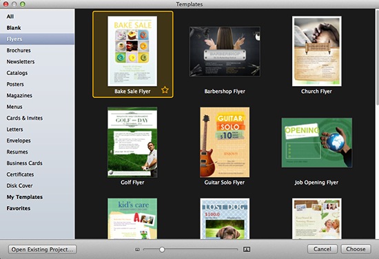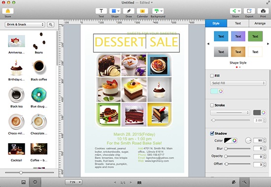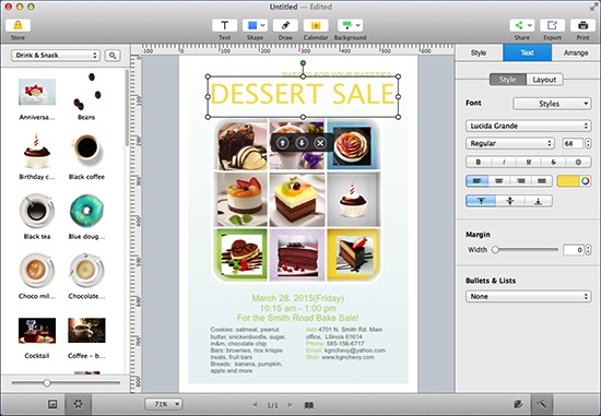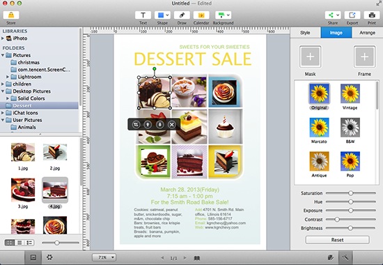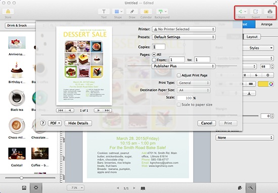 You have several options to deal with your finished flyer: One is to share it anywhere via Email, Facebook, etc.; one is to save it as image files on your Mac for later use (for projects intended for printing, the best choice is to save as PDF); one is to directly print it out with your own printer.