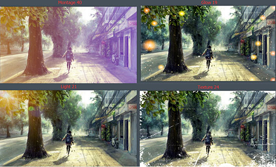 Go to lighting effect feature and switch between the four different tabs of Montage, Light, Glow and Texture to try any lighting effect you like. You are able to layer up photo effects from the four categories onto your added photo. Here we try the 40th photo effect in Montage, the 21st effect in Light, the 19th effect in Glow and the 24th in Texture.