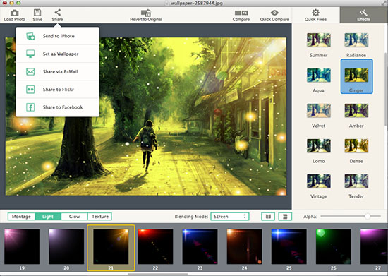 Once you are satisfied, you can quickly share it to Facebook, Flickr or through email. You are able to send the photo directly to iPhoto as well as save it as image file to your folder. If you want, simply save it as desktop wallpaper.