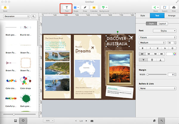 Click Text toolbar on the top to add text objects into your work. An exciting headline is a nice complement to the brochure design. Write a short message and give it a prominent position in the document. Don’t forget to make it big and easily noticeable and choose some nice-looking font that works with the Christmas theme.
