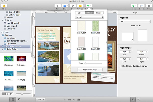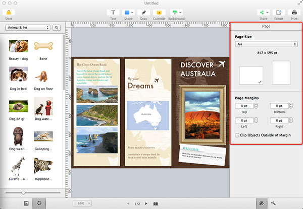 Layout is an important initial guide for determining the position of text, images, or other design elements. First choose the page size to fit your needs. If you don't see the desired one you want in the page size combo box, just go to menu File -> Page Setup to customize your own size.