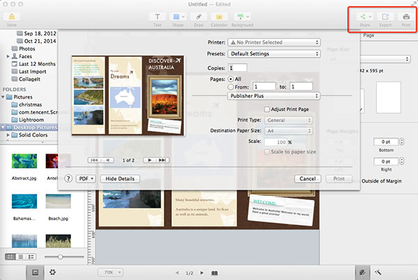 Once the brochure is completed, go to the upper right corner and click Print to directly pint it out and send to clients. Also, you have options to simply share the brochure online via Email, Facebook, etc.