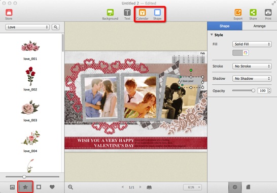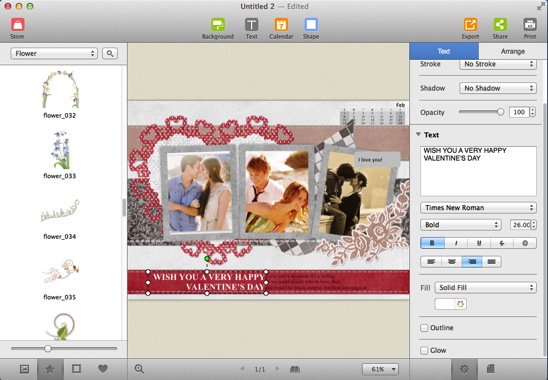 When you make greeting cards, you should always add some personal messages. Text may come up with the template, but you can change it to say anything that you like. Simply click on the template's text, and start typing your own personalized message in text box on the right Text panel, where you can also change the text formatting. Options include font size, style, color, fill, outline, glow, etc.