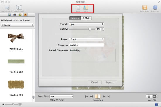 Click the Export toolbar button and make export settings (Format, Quality, Pages, etc.) to output your card as image or share via email.