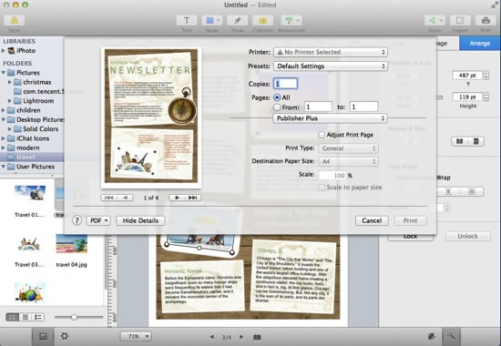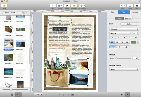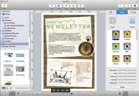 There are many preset pictures on the newsletter template, and you need to replace them with your own. Easy access to iPhoto, Aperture and your Finder is available on the left panel. Simply choose the photo you’d like to use and drag it onto one of the existing pictures. Also you can choose beautiful clipart inside the app and with the option of searching online images.