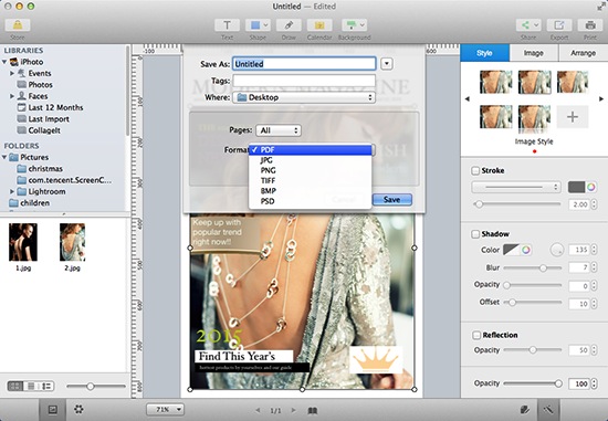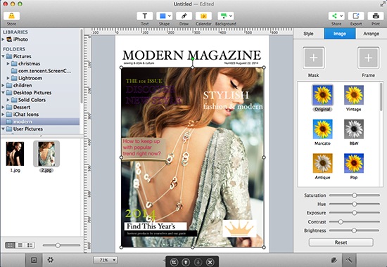 There are many preset pictures on the template, and you need to replace all with your own. Open your iPhoto library or other folder on the left panel, then choose a photo you’d like to use and drag it onto one of the existing pictures in the magazine.