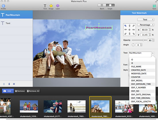 Easily click Text button at the top toolbar to add a text to your photos. Then choose a watermark style from the two options of Text and Script. You can freely adjust the text position, opacity, angle, font and its style. Besides, Watermark Plus can easily handle other info of your photos such as FILE_NAME, CREATED_DATE, MODIFIED_DATE, COUNTER, EXIF_MODLE, etc.