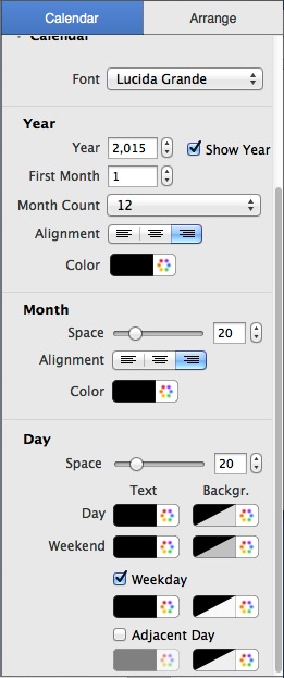 Set Year, First Month, Month Count, Alignment and Year Color on the Year inspector.