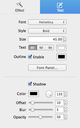 to insert text. Double click to edit the text. Customize text Font, Style, Size, Outline and Shadow, etc. on the Text tab.
