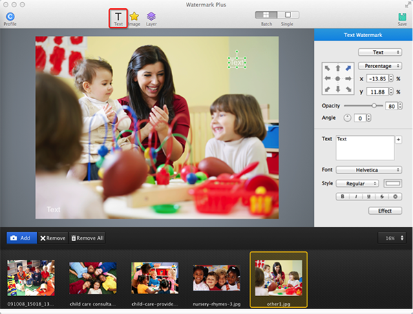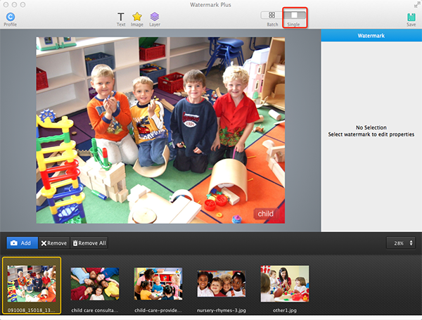 button to switch to Single mode, where you can separately adjust the watermark on each photo with different position, size and rotation.