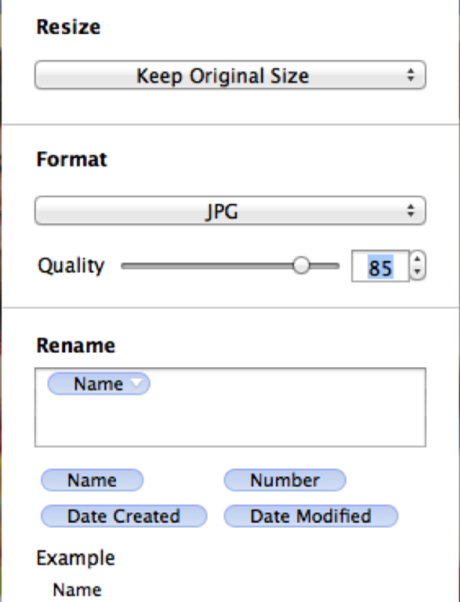 Simply drag and drop wildcard character such as Numbers, Date Created, or Date Modified to the box to rename your photos at will.