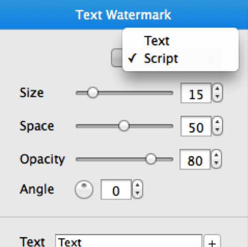 Add Scrip TextClick Script in the combo box to set a text script watermark for your photos as needed. Script adjustment options are also available.