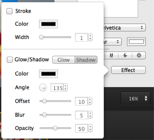 Click Effect to set Stroke, Glow/Shadow for text.
